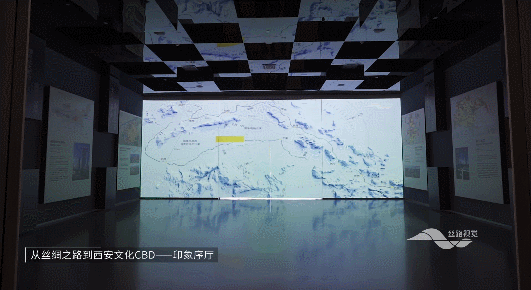 丝路蓝在西安文化商务区展示中心这个晶莹透亮的立方体建筑内设计了一个暗空间,以机械开合门连接序厅与主规划沙盘区,烘托层层递进的深邃氛围。