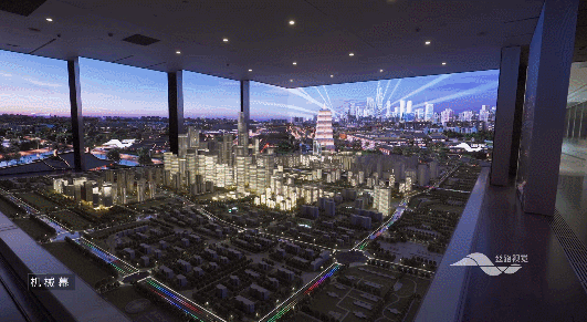 西安文化商务区展示中心的主规划区域,在沙盘模型两侧设置机械开合幕,伴随动感的音乐与模型共鸣舞动,联袂献上精彩纷呈的移动光影秀。